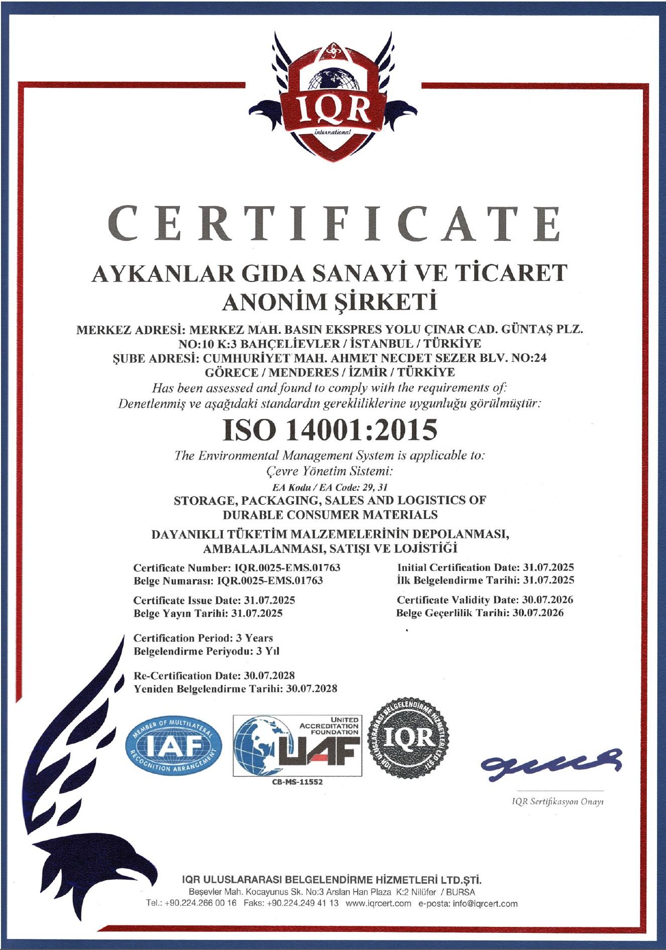 AYKANLAR GIDA SAN.VE TİC.A.Ş. olarak ISO 14001: Çevre Yönetim Sistemi Kalite Politikamız kapsamında;