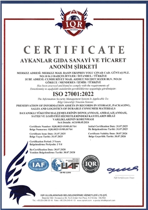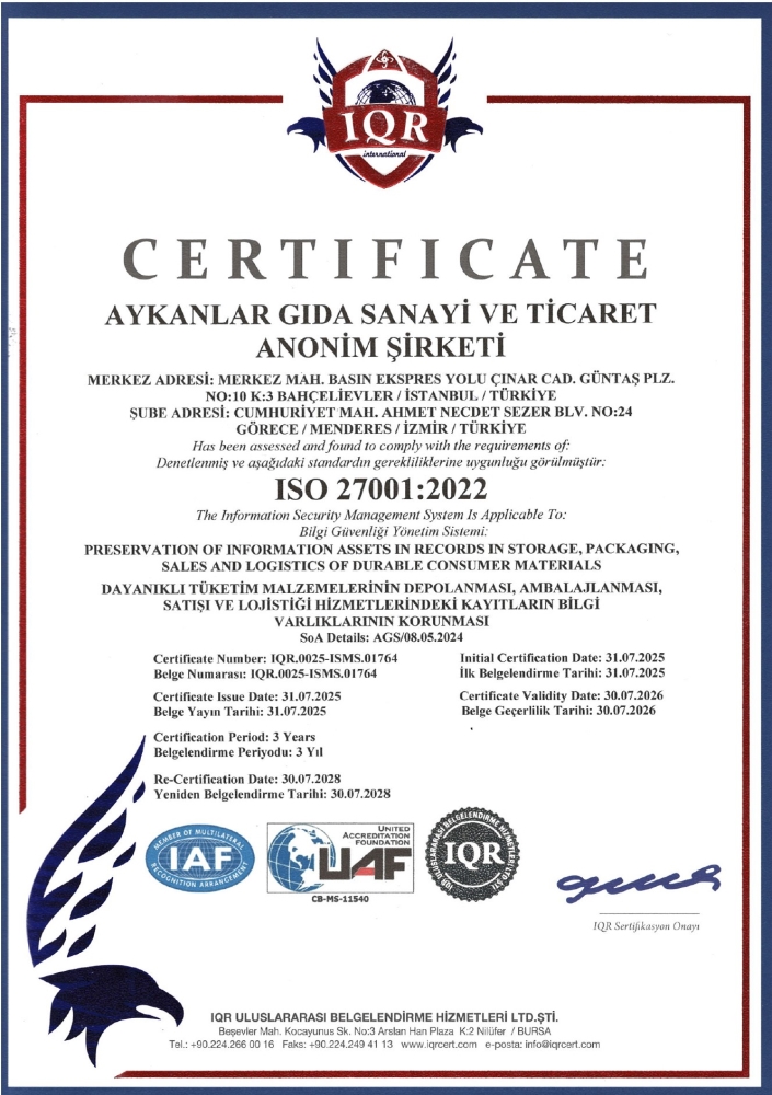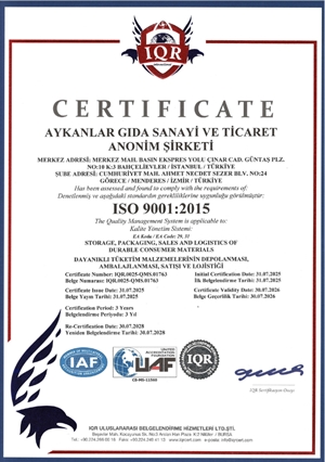 AYKANLAR GIDA SAN.VE TİC.A.Ş. olarak hedefimiz ISO 9001:2015 Kalite Yönetim Sistemi'nin gerekliliklerini yerine getirmek ve gerekli görülen iyileştirmeleri yaparak sürekli dinamik bir sistem sağlamaktır. Kalite politikamızı bu bakış açısıyla oluşturuyor, sistemlerimizi sürekli geliştiriyoruz.